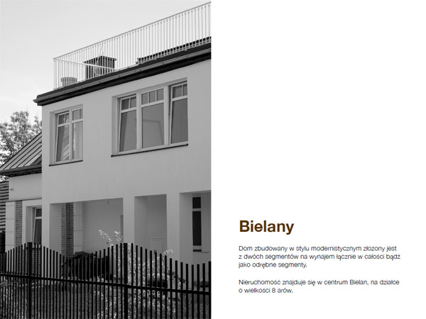 Dom zbudowany w stylu modernistycznym, złożony jest w dwóch segmentów, na wynajem w całości bądź jako odrębne fragmenty. Zobacz prezentację poniżej.